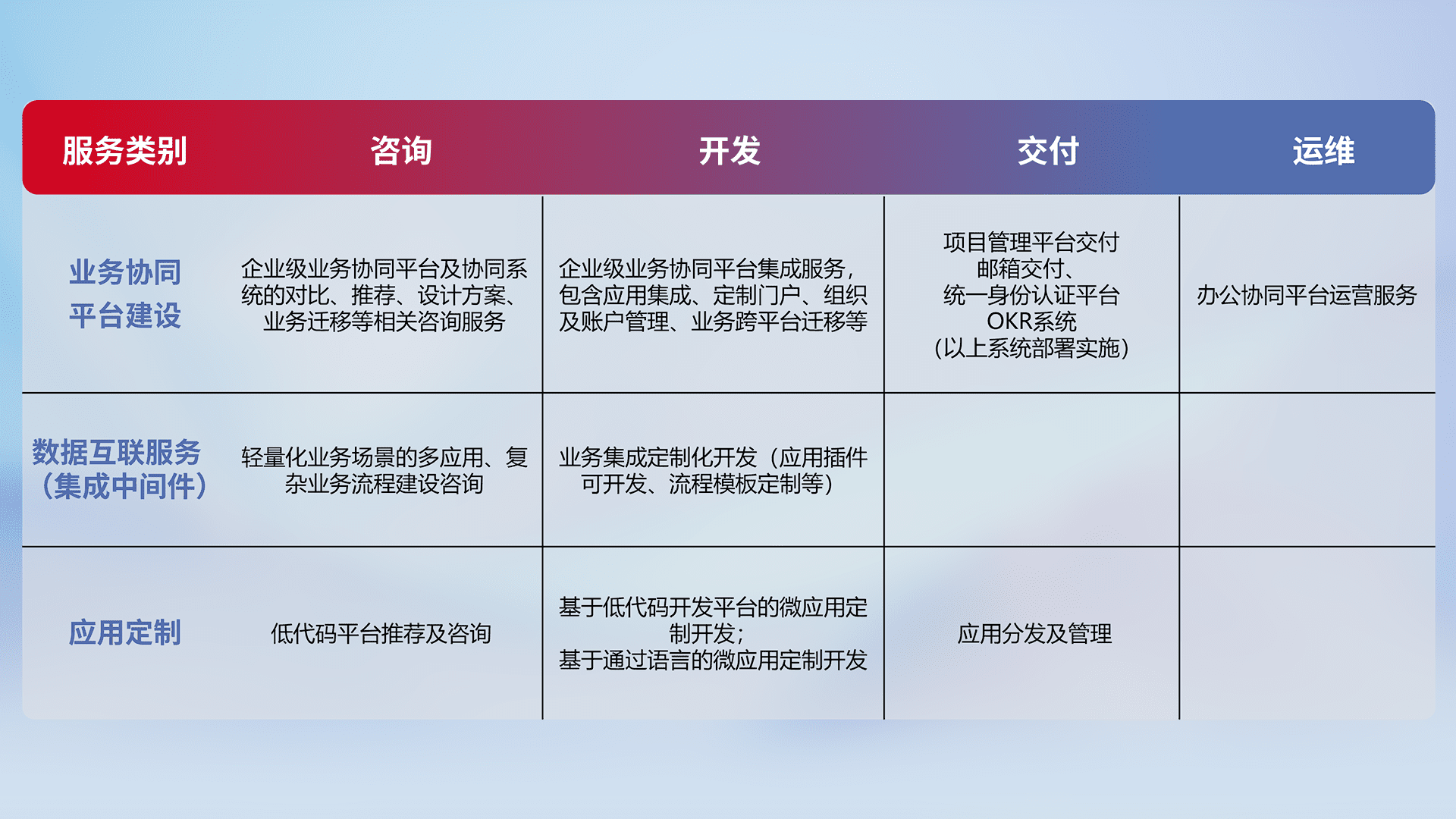 针对钉钉、、企微、、IDaas等平台级产品提供产品的规划、、、、方案、、、、交付、、、、定制化开发等服务,,,,实现如统一协同办公、、、、智能客户服务、、、混合会议管理、、智能数据查询、、等业务场景,,,实现数字化转型。。。。